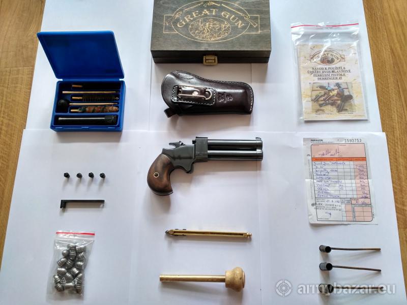Popis: Prodám Derringer .45 3,5" v černém brynýru od Great Gun. Přidám k tomu kožené pouzdro na opasek,nabíják kulí,sadu čistění cal.45,klíč na pistony,4 náhradní pistony,ládovačku(zásobník) na zápalky a pár kulí. Zbraň mám od loňska(viz.účet), a má odstříleno přibližně 50 výstřelů(prodávám jí, neboť se stěhuji do zahraničí) Cena 8000kč Tel: 720694123
